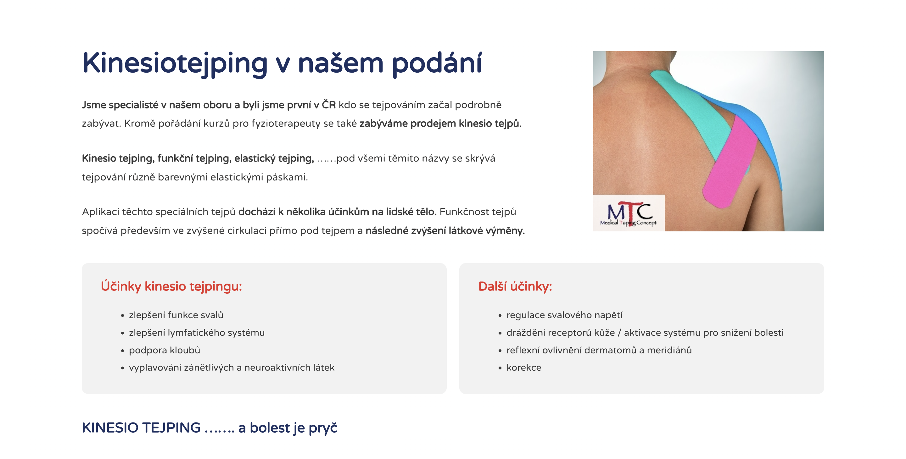 Jsme specialisté v našem oboru a byli jsme první v ČR kdo se tejpováním začal podrobně zabývat. Kromě pořádání kurzů tejpování pro fyzioterapeuty se také zabýváme prodejem kinesio tejpů.